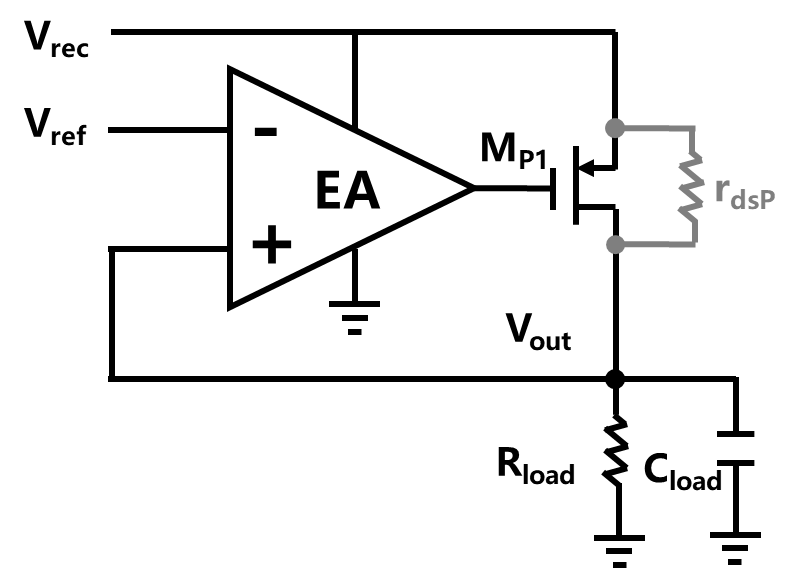 整流电路的输出通常包含了大量纹波。尽管可以通过增大电容来有效降低波纹,但在植入芯片中,由于内外线圈之间的距离、错位等因素,导致内部线圈获得的交流电压本身就存在显著波动,因此需要进一步对输出电压进行稳压。植入式芯片中往往采用低压差稳压器(low dropout regulator, LDO),来减小功率损耗。LDO属于线性稳压器的一种,它利用一个高增益放大器来控制BJT或者MOSFET传输管的电阻,使得该电阻和负载电阻组成的电阻分压器始终保持所需比例,进而产生预期的输出电压,图8-27给出了典型的LDO电路结构,主要包含了误差放大器(EA)以及其控制的传输管Mp1。很显然,LDO的功率损耗和Vrec-Vout成线性关系,由于Vrec和Vout之差只在数百毫伏之间,因此LDO仍可以保证较高的转换效率。事实上,由于LDO结构相对简单,面积小且噪声较低,在大多数低功耗应用中,线性调节器都采用低压差(LDO)调节器。